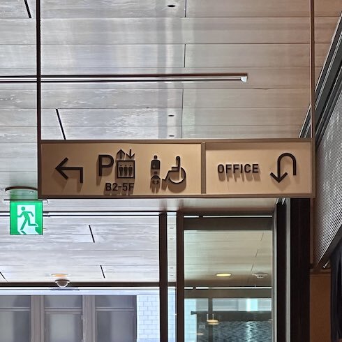 デザインとして洗練されており、光が反射しても見やすいという点では機能性もある立体のピクトグラム。しかし、このように環境によってはかえって視認性が下がってしまう場合もあるという、デザイナーの視点ならではの発見です。