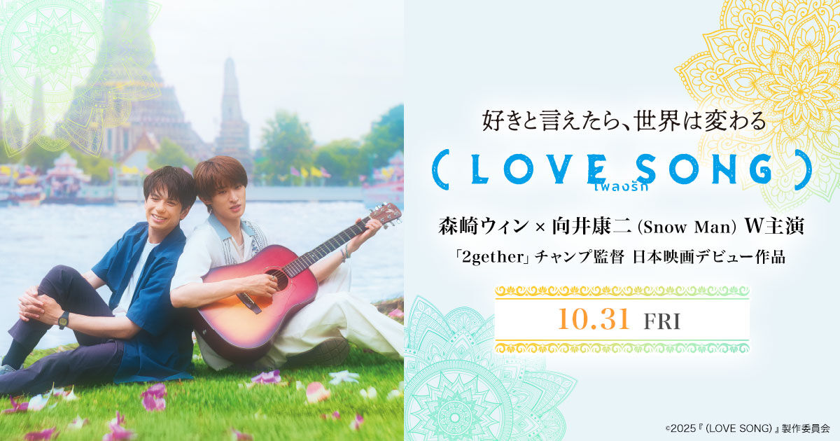 | 森崎ウィン&Snow Man向井康二W主演『(LOVE SONG)』初公開シーンも 主題歌・Omoinotake「Gravity」SPリリックビデオ解禁 Manの向井康二がW主演を務める、日タイ合作のオリジナル映画『(LOVE SONG)』(10月31日公開)の主題歌で、初披露となる本編映像や場面写真… (出典:オリコン) |