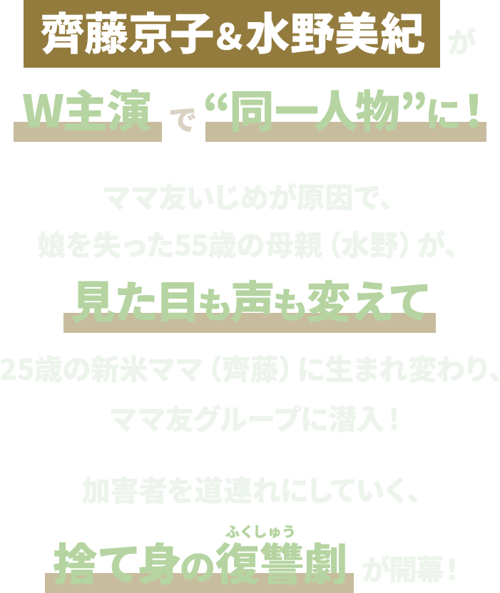 @oricon齊藤京子&水野美紀 “同一人物”役で連ドラW主演🔥 『娘の命を奪ったヤツを殺すのは罪ですか?』 ママ友いじめで娘を失った母親(水野)が 新米ママ(齊藤)に生まれ変わる… 衝撃設定に「どういうこと⁉️」 💬齊藤&水野コメント oricon.co.jp/news/2405151/?… #娘の命を奪ったヤツを殺すのは罪ですか pic.x.com/SQQVfYwnb7